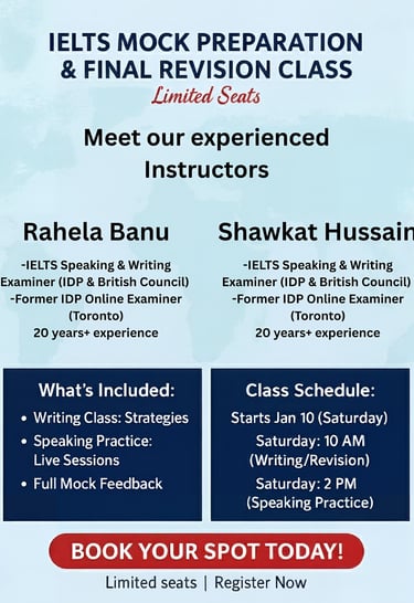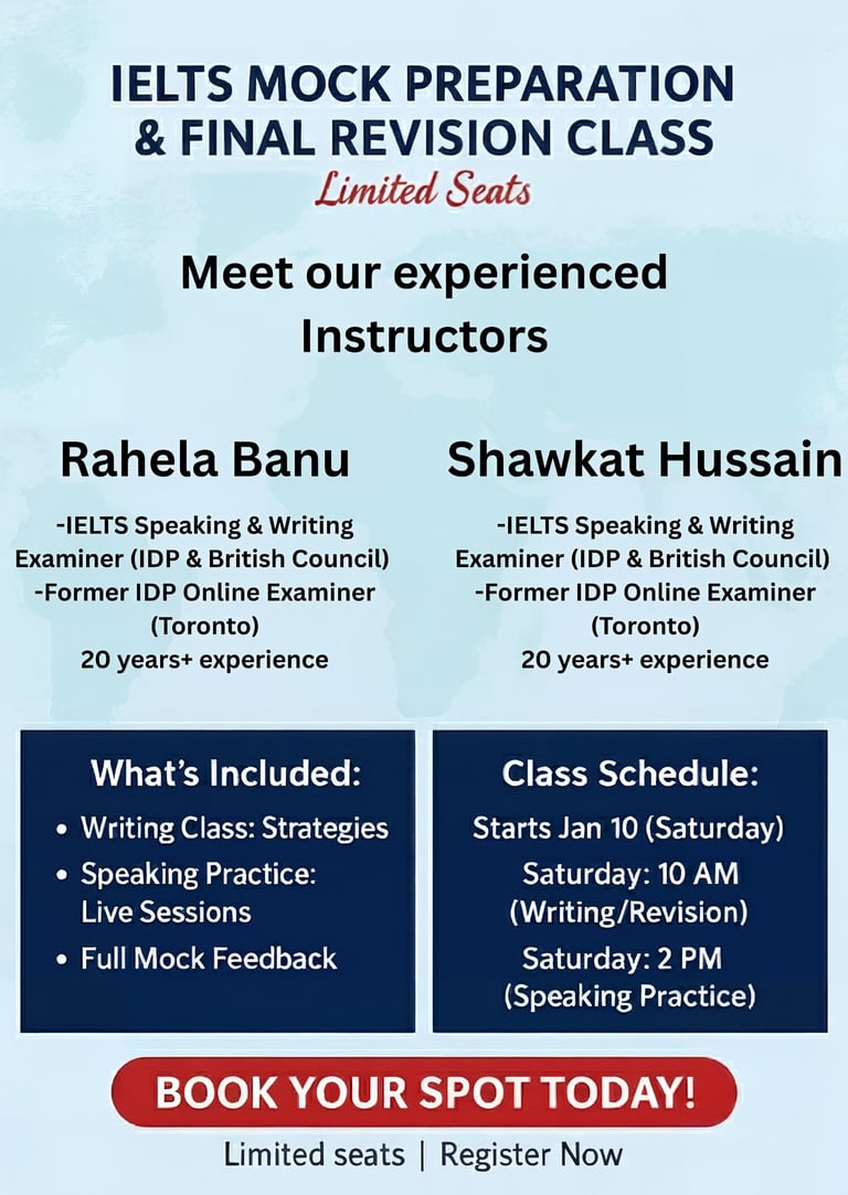 Join our IELTS Mock Preparation and Final Revision Class, a one-month crash course designed to give you real exam experience and expert feedback. You’ll learn directly from two senior IELTS examiners, each with over 20 years of experience, who have examined for IDP and the British Council in both Canada and Bangladesh.